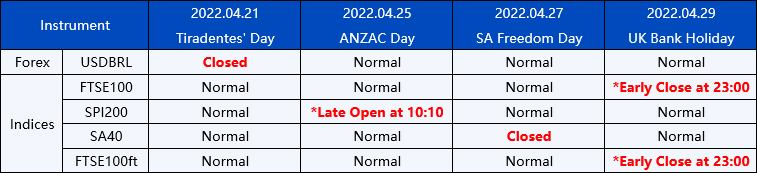 Please be advised that the following instruments’ trading hours and market session times will be affected by the upcoming April holidays.